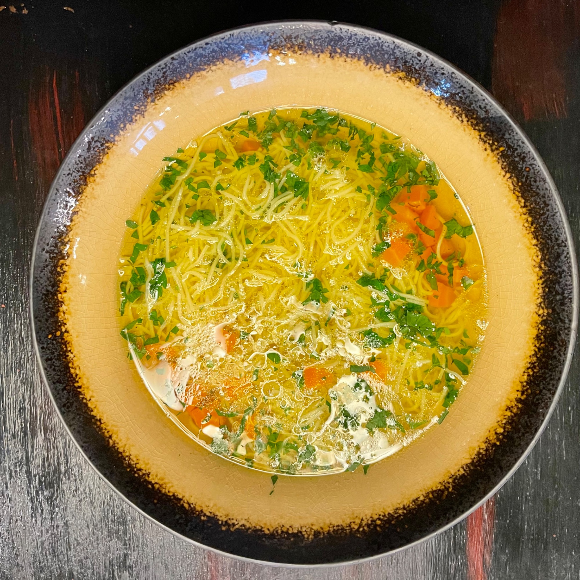 (Temp. przy dostawie max. 80st. C.) Rosół gotujemy praktycznie każdego dnia (w zależności od potrzeb) z trzech rodzajów mięsa drobiowego i wołowiny z potężną ilością warzyw (marchew, pietruszka, seler, cebula opiekana) i ziół i przypraw (nać pietruszki, lubczyk, ziele angielskie, liść laurowy) -